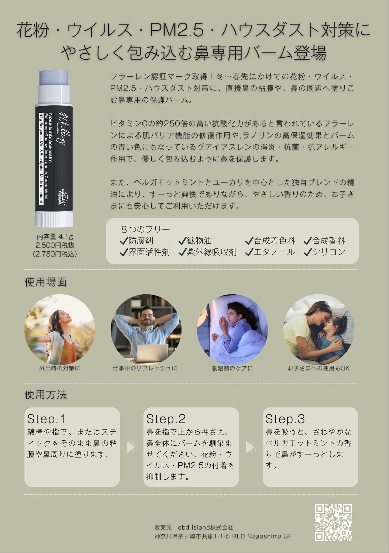 花粉・PM2.5・ハウスダストが気になる季節に。鼻周りをやさしく包み込むノーズバームが登場!フラーレン認証マーク取得。100%天然由来成分 でつくられた、鼻専用の保護バームです。ワセリンやミネラルオイルを使用しないやさしい処方 で、鼻の周りや粘膜になじみ、しっとりとしたヴェールを形成します。
