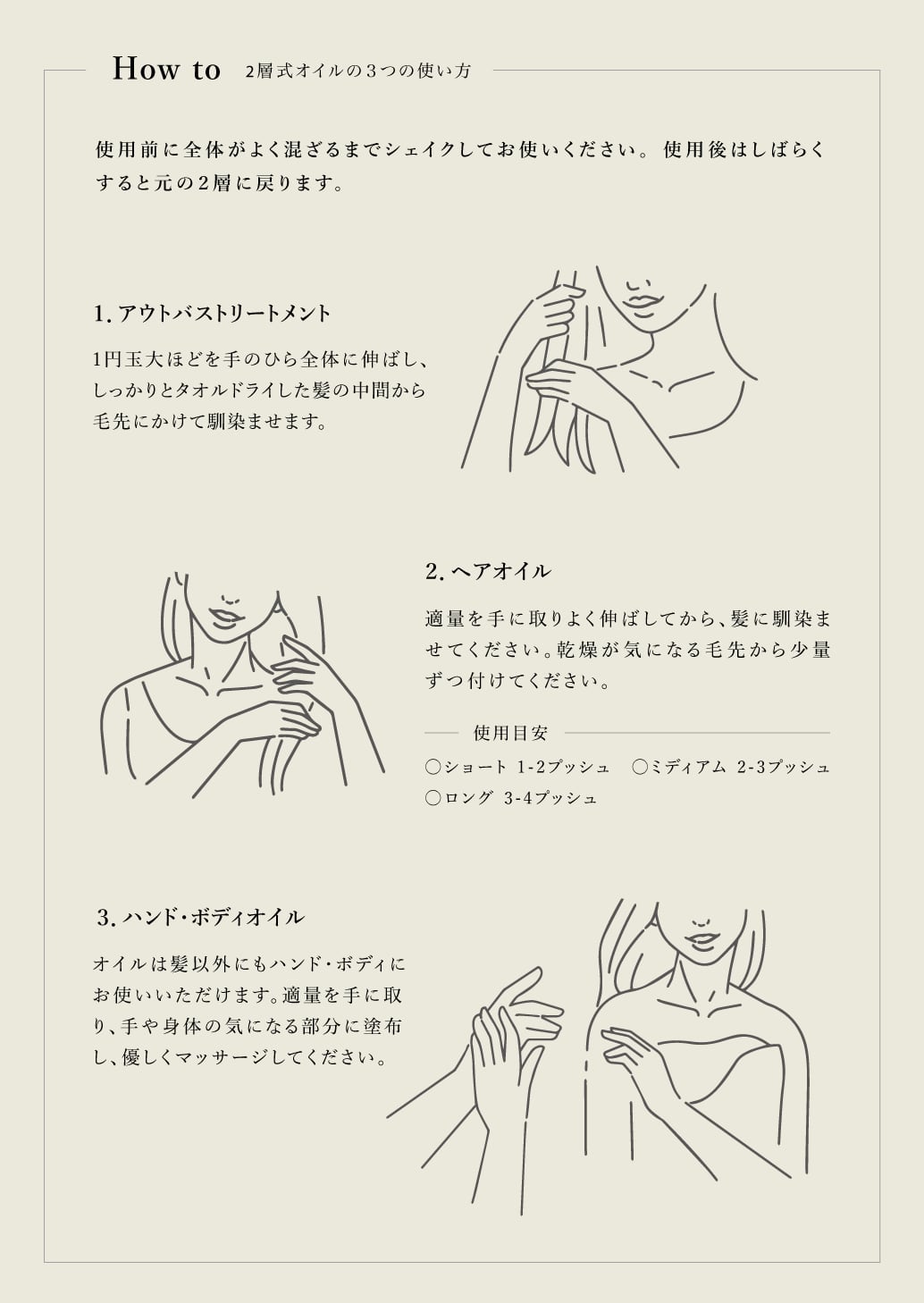 手に残ったオイルはハンドケアとしてもお使いいただけます。